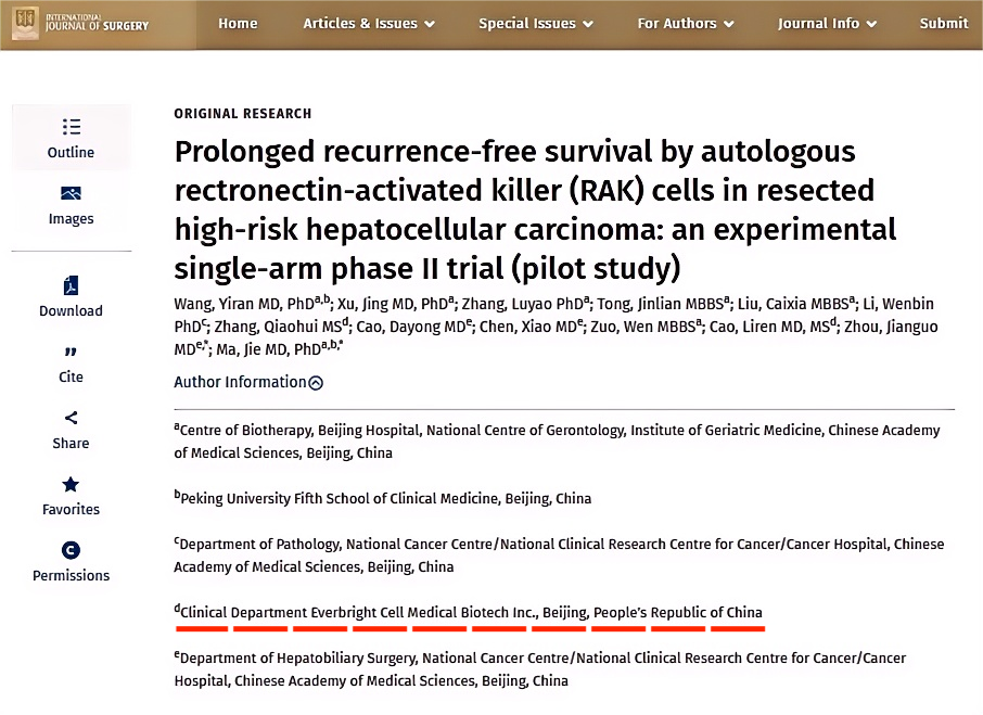 Wang Y, Xu J, Zhang L, Tong J, Liu C, Li W, Zhang Q, Cao D, Chen X, Zuo W, Cao L, Zhou J, Ma J. Prolonged recurrence-free survival by autologous rectronectin-activated killer(RAK) cells in resected high-risk hepatocellular carcinoma: an experimental single-arm phase ll trial(pilot study). Int J Surg. 2025 Jul1; 111(7): 4422-4433. doi: 10.1097/JS9.0000000000002417. Epub 2025 May29. PMID: 40440678.