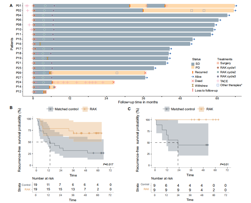 在纳入生存分析的19例患者中,1年无复发生存率高达79%(15/19),3年无复发生存率亦达到68%(13/19)。与匹配的对照组相比,接受RAK细胞治疗的患者中位无复发生存期尚未达到,而对照组仅为13.2个月,风险比(HR)为0.31(95%CI 0.12-0.81,P=0.017)。这一数据充分表明,自体RAK细胞注射液能够显著降低肝癌复发风险。